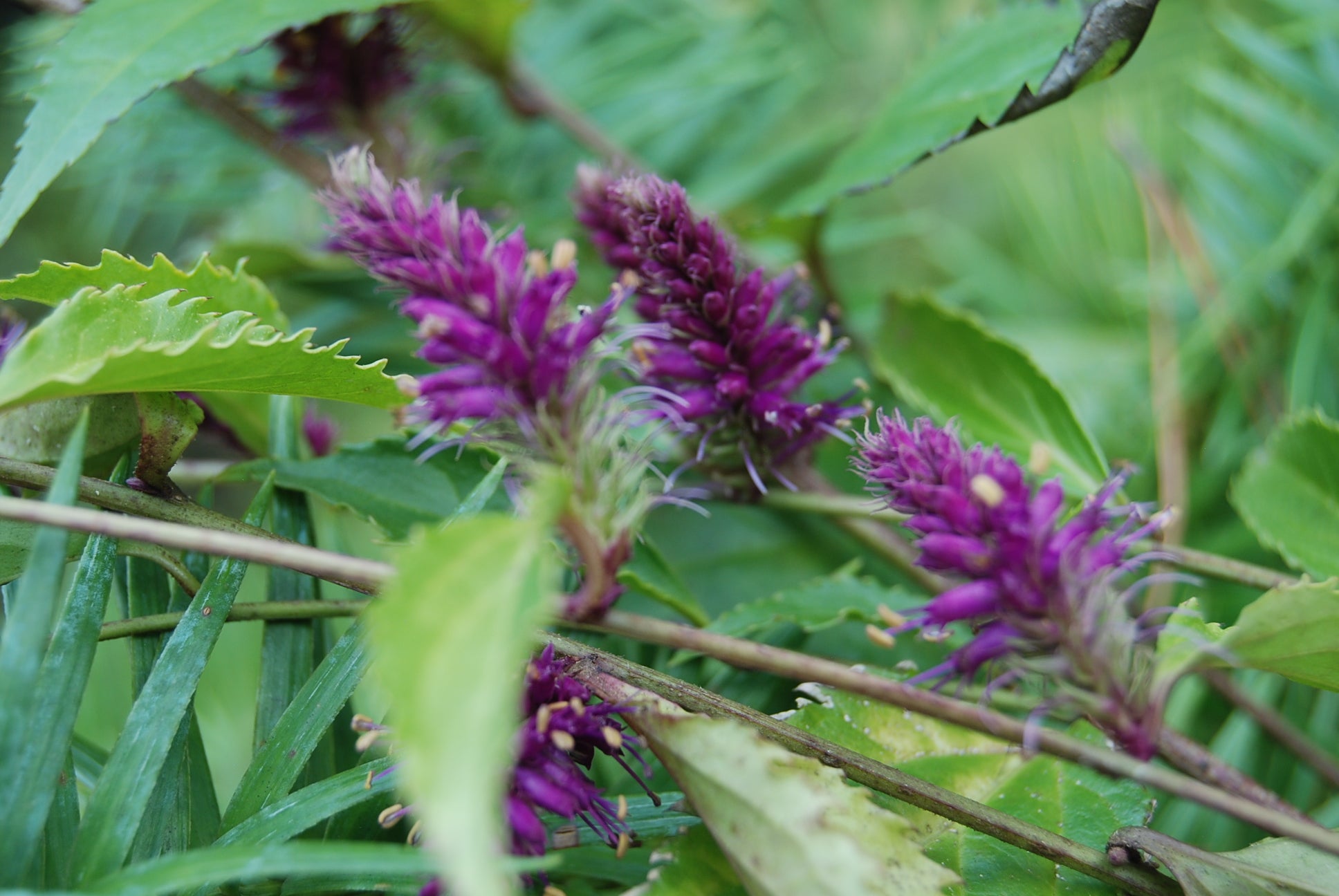 Chinese Trailing Veronicastrum. I first saw this perennial at the Atlanta Botanical Garden in their woodland garden and was immediately struck by its form and beauty. It is so unlike other species in this genus because of its spreading habit. Its leaves are 4-5" long, a dark glossy green on burgundy stems which grow outward from the center, giving it a mounding, spreading growth habit. Each leaf bud generates a 2" spike of purple-burgundy flowers from about early summer to fall. This is going to make a wonderful shade perennial to mix with ferns and Hostas. When grown here in the shade in zone 8, it remains evergreen during much of the winter. Native to China. The last picture is the size that we are shipping.