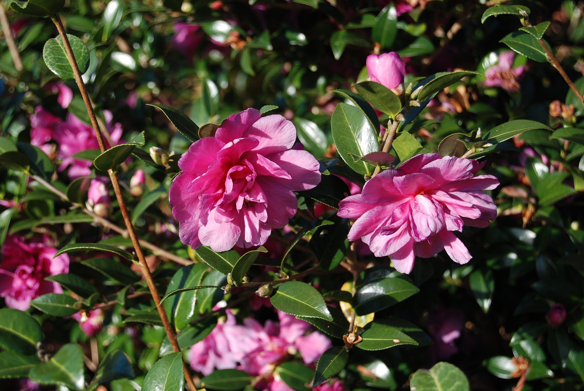 Chansonette Sasanqua. This cultivar is one of the better Sasanquas with a spreading growth habit. It is broader than high. I have seen it used almost as a tall ground cover. It has double deep pink flowers. Monrovia describes it as 8 ft. wide and 2-3 ft. high. It is quite vigorous and can be spaced quite far apart if used as a mass effect.